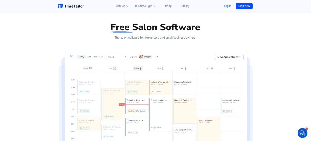 TimeTailor also covers the operational side: a smartphone POS for card and phone payments, automatic SMS and email reminders, deposits to prevent no-shows, and team scheduling for multi-staff salons. The platform is free for business owners — a small fee is charged to the client at checkout instead of a monthly subscription, which makes it a good fit for anyone starting with a limited budget.