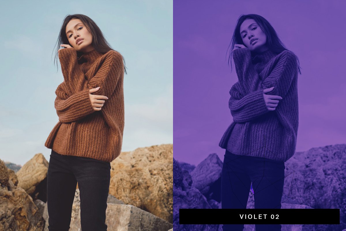 Violet (10 Presets) – Various regal purple duotones.