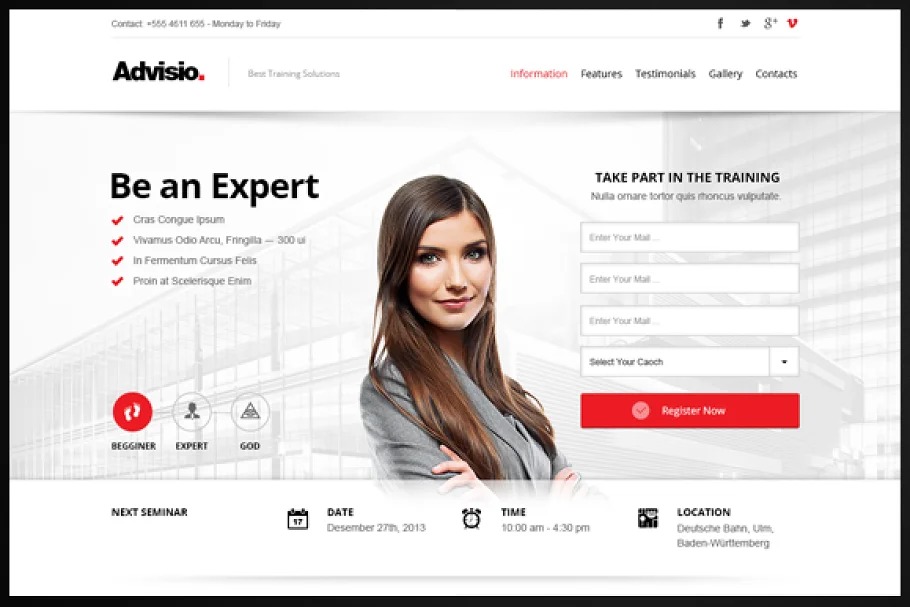 Advisio is onepage Landing Page Template for showcasing needs. Advisio incorporate three extraordinary and responsive promotion formats dependent on Bootstrap Framework. Clean and exemplary plan.
