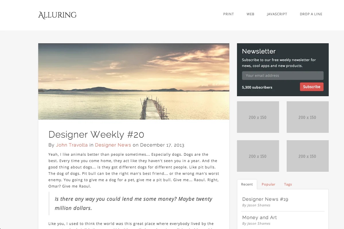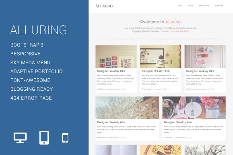 Appealing is a blog style format intended to give the client a straightforward, rich and up-to present day standard web based writing for a blog layout that you can without much of a stretch redo for any CMS/contributing to a blog stage. Based on Twitter Bootstrap 3, Alluring comes portable first with every one of the system’s highlights altered for this particular layout. If it’s not too much trouble, note that this isn’t a WordPress subject.