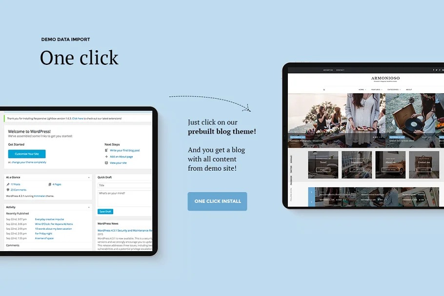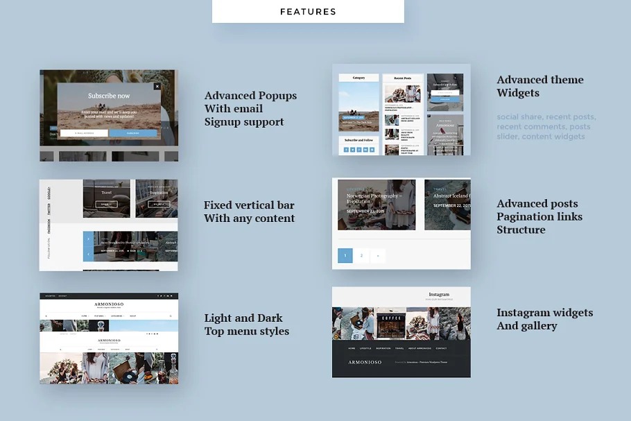 Limitless blog styles and design blends (diverse header styles, 7 blog posting formats, 10+ Featured Posts Slider formats, 650+ textual styles), Unlimited shading subjects (12 predefined, limitless to make yourself), many configurable choices – and the entirety of this you can make do with 1 snap of your mouse in our novel easy to use Armonioso Control Panel.