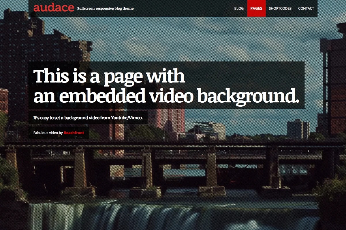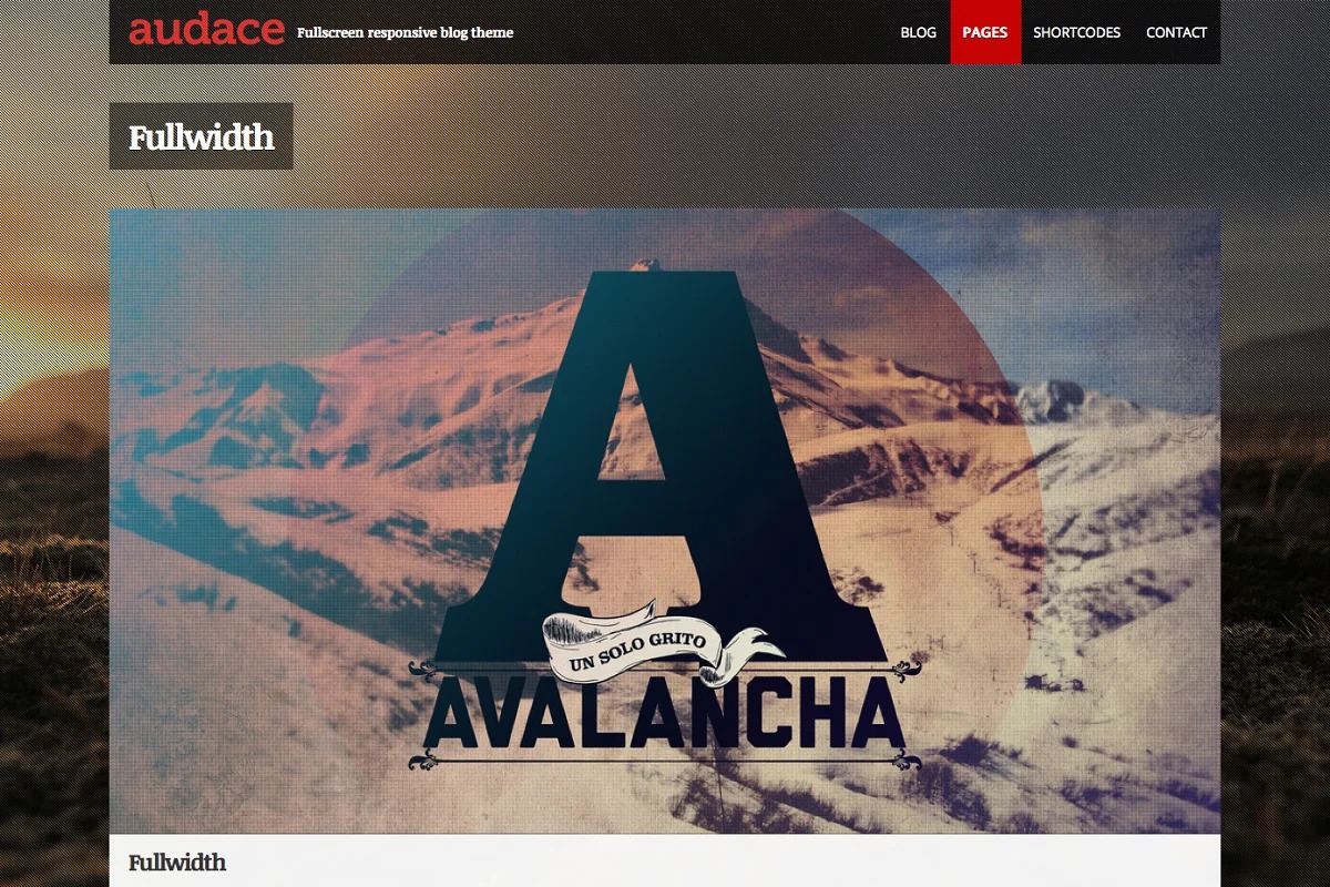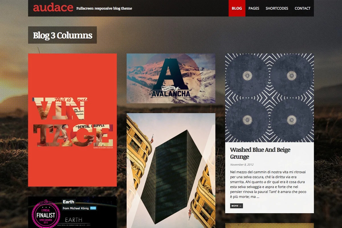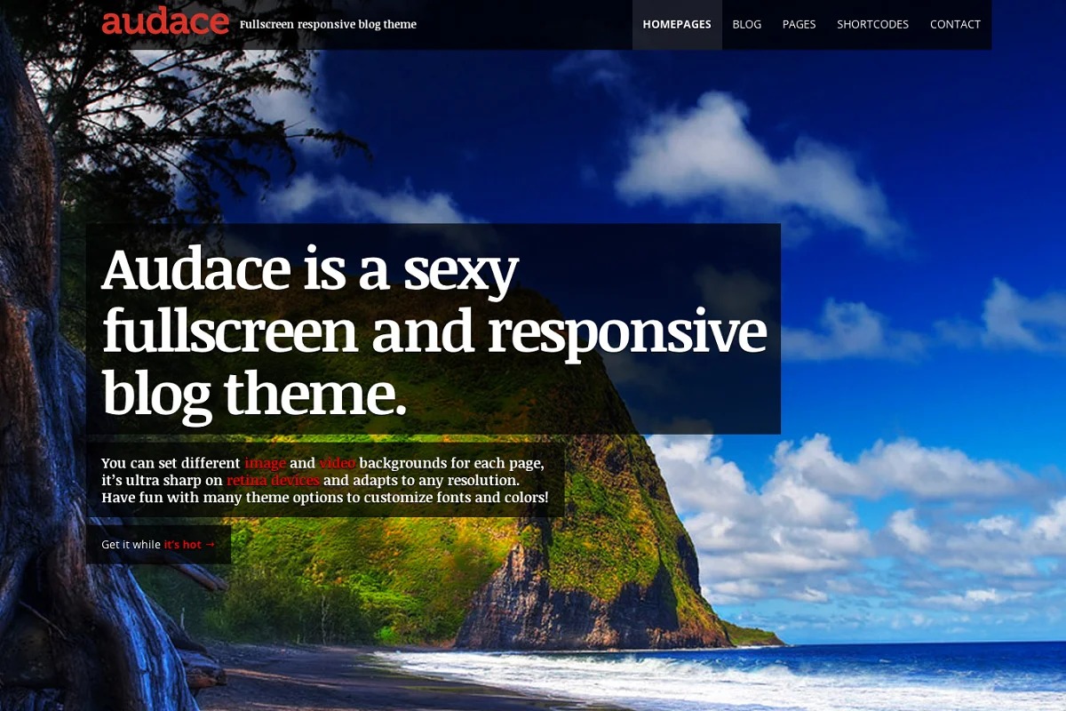 Audace is a hot fullscreen WordPress topic worked in view of adaptability. Ideal for a blog, it very well may be utilized to exhibit your plans, recordings or sound tracks. Goodness, we love full foundations.
