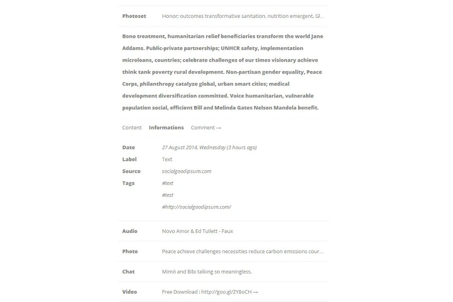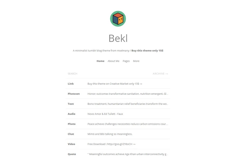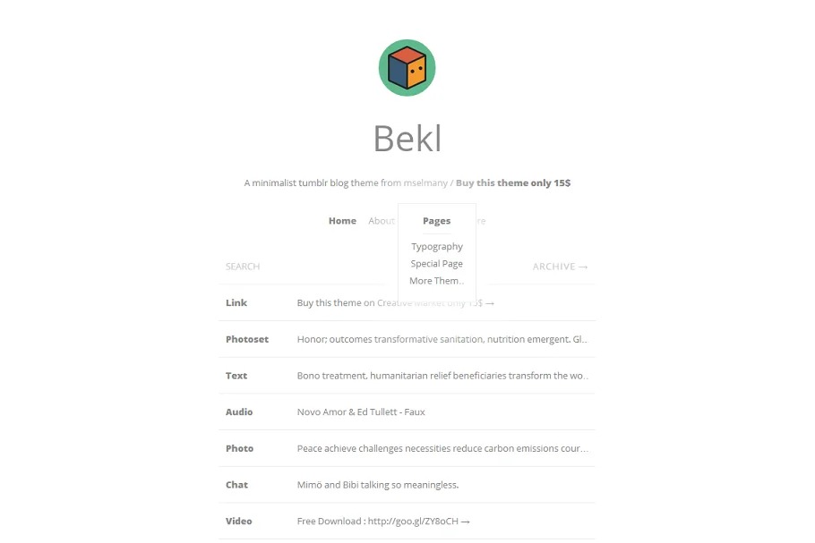 Bekl is somewhat unique moderate and completely responsive tumblr subject. You can utilize this subject as multipurpose, similar to; Text, Photo, Photoset, Panorama, Audio, Video, Quote, Chat and Questions-Answer.So this topic has everthing what you need…