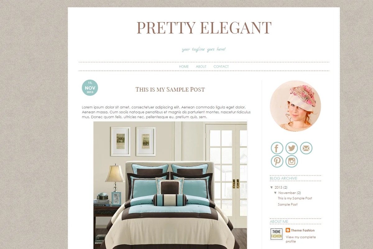 Pretty Elegant is a smart and lovely premade blog format intended for the Blogger stage. Made with delightful text styles and shading mixes including the hand craft highlights like the top route bar, web-based media symbols, custom Share Post connections under each post and classy Date design.