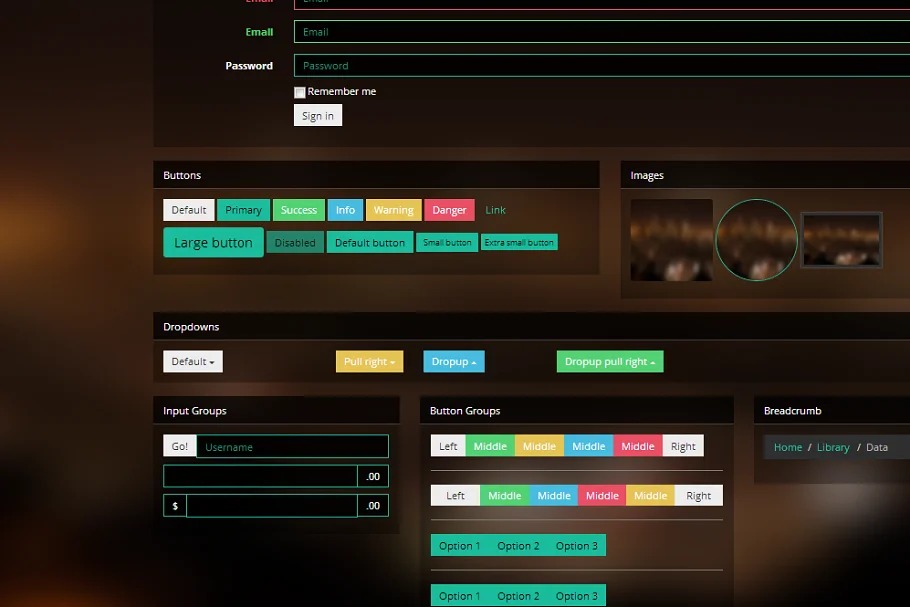 – Less documents included (All Bootstrap Less + custom variables.less, theme.less ) = simple alter and redesign