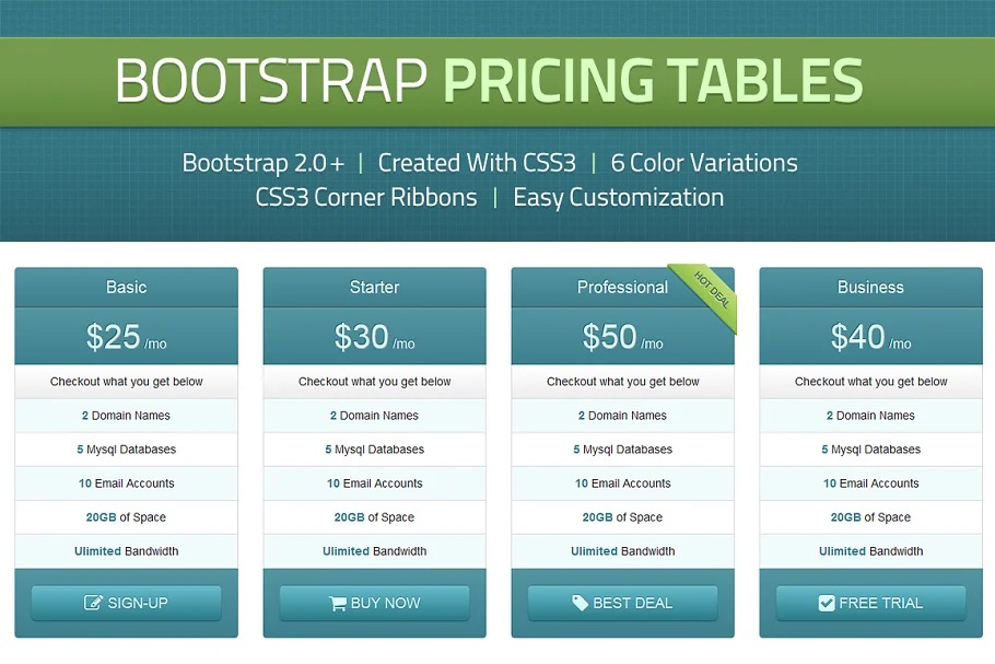 Twitter Bootstrap CSS3 Pricing Tables Includes 6 Color Variations with CSS3 Corner Ribbons. Simple execution, essentially incorporate “evaluating tables.css” document into your present Twitter Bootstrap project. From that point, you can without much of a stretch reorder the valuing table code into your undertaking.