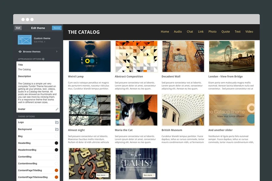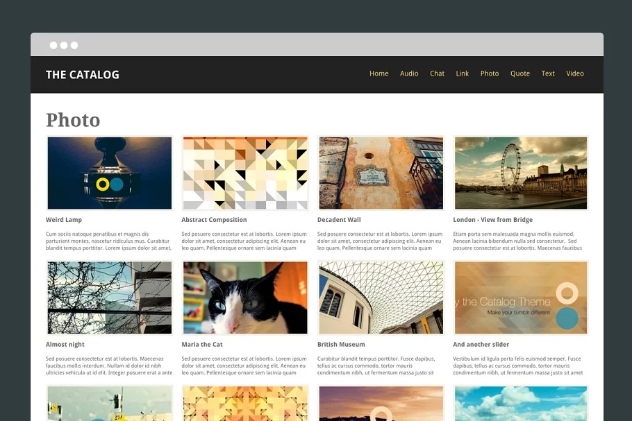 Index is a straightforward yet extremely complete Tumblr Theme zeroed in on getting all your photographs, text, recordings, sound in an inventory like organization. All posts are shown as thumbnails and you can see more by clicking them. It’s a responsive subject that functions admirably in various screen sizes.