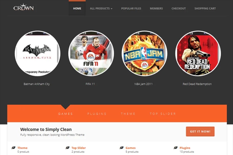 Crown is a WordPress Ecommerce Theme uniquely intended for WordPress Marketplace Plugin ( http://wordpress.org/expand/modules/wpmarketplace/).