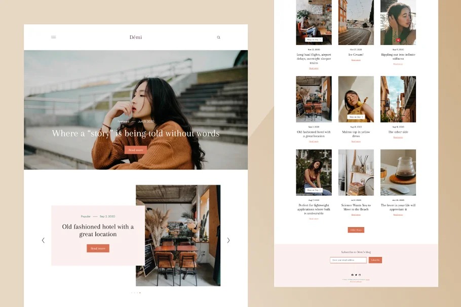 An exemplary topic with an immortal look. Demi is perfect and versatile network based design for craftsman, style blogger and picture taker. With “purchase button” support, Demi assists you with writing for a blog and sell stuffs — or advance your items—such that’s drawing in, allowing guests to make the most of your articles in an incredible manner.