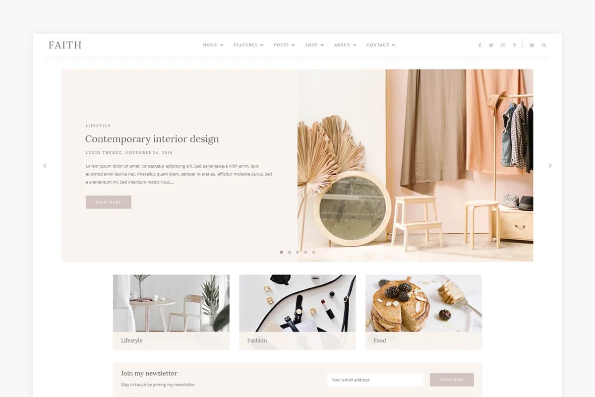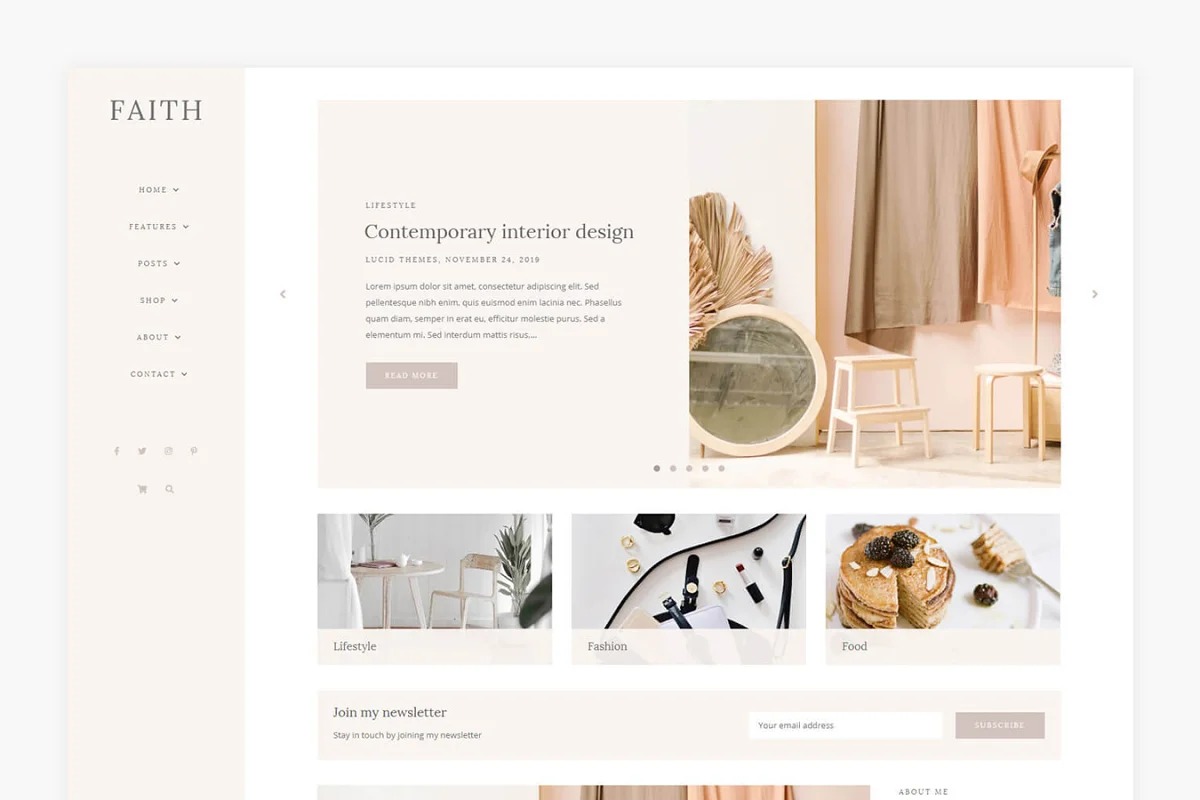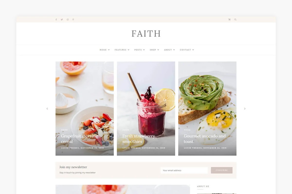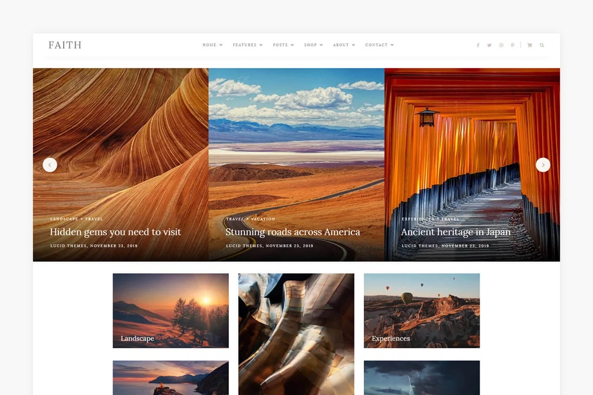 Included close by the default WordPress gadgets, are custom gadgets planned explicitly for Faith. Custom gadgets for an about segment, most recent posts, Instagram, promotion boxes, picture flags, and an online media segment.