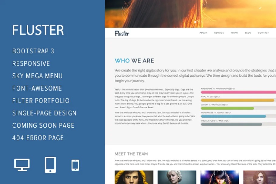 • Bootstrap 3.0 • Responsive format • Easy to alter • Sky Mega Menu • Filter Thumbnail portfolio • Font-Awesome Icons Collection • 404 Error Page • Coming before long page