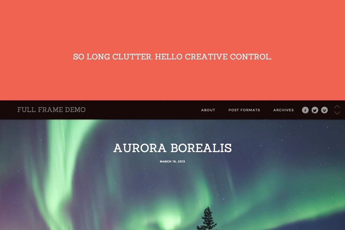 Full Frame upholds the accompanying social symbols: Twitter, Facebook, WordPress, Google Plus, LinkedIn, Pinterest, Flickr, Vimeo, YouTube and Tumblr.