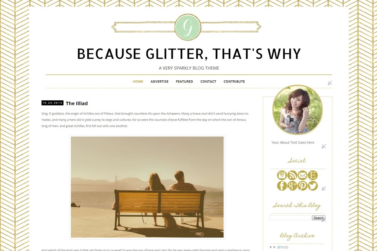 Purveyor of Geekery’s Because…Glitter Blogger Theme, since what else is there, truly? No Photoshop required with this topic, not so much as a visual creator. Control the textual styles, text and shades of the monogram and social symbols from your dashboard. No sticking around or paying extra in the event that you need an adjustment of a couple of months!
