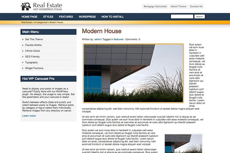 Hot Real Estate topic for WordPress is committed to all sites that work with genuine bequests. It very well may be utilized by realtors or organizations to promote houses, lofts, and other sort of genuine bequests they are selling. This topic is controlled by two business and one free module. On the first page, you can see the enormous posts rotator made by Hot WordPress Carousel Pro module. On the posts, there are little pictures of genuine domains that open slide show made by Hot Photo Gallery module. All topic purchasers will get the modules gratis.