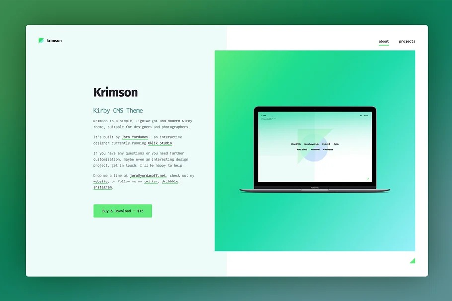 Krimson is a basic, lightweight and current Kirby CMS topic, appropriate for architects and picture takers.