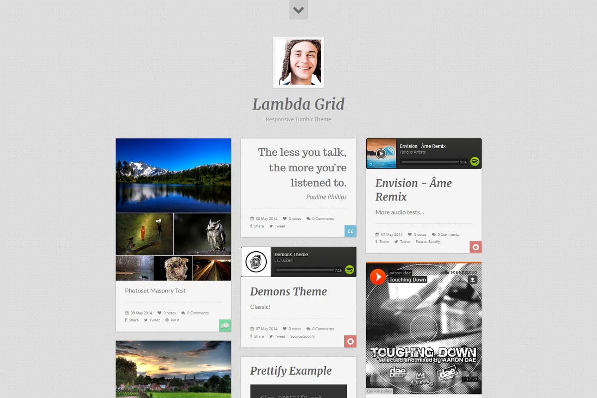 Lambda is a responsive Tumblr subject with in excess of 60 customization choices and 3 page formats – one section, exemplary sidebar and 3 segment brick work network design. You can undoubtedly turn on/off specific components like Instagram, Flickr, Twitter, Dribbble or Logo gadget.