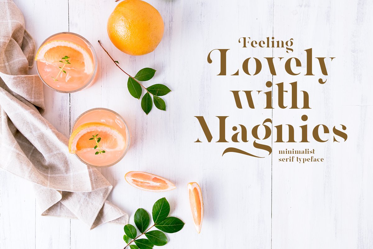 Feel the sweetness with Magnies, a moderate serif textual style with clean stencil looks. The ladylike letterforms which are ideal for logotype, design, and show.