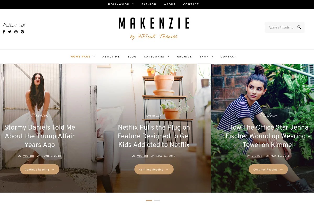 Makenzie is a dynamic and outwardly shocking WordPress Theme particularly intended for Magazine, Fashion and Lifestyle Blogs. The topic is not difficult to arrangement and modify, you need only a couple snaps, and you can altogether change the vibe of the site!