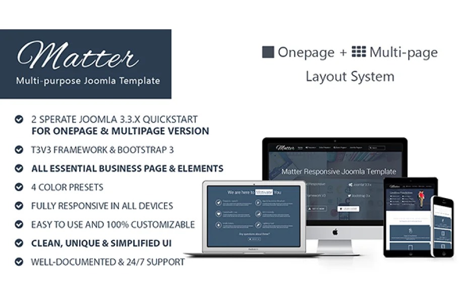 Matter – is a Multi-reason, Clean, Super-adaptable and Fully Responsive Joomla! 3.3.x Template. Which is ideal decision for any sort of Onepage and Multipage Business/Corporate, Agency and Portfolio Websites. It accompanies Onepage and Multipage Version Including 2 Quickstarts thus, you can make your Onepage or Multipage site in no time. Matter worked with Most Stable and Powerful T3V3 Framework including all Business Pages and Cutting-edge Features.