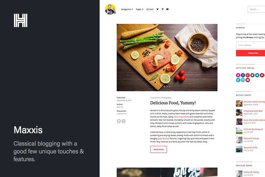 Maxxis is a finely created conventional publishing content to a blog WordPress topic worked for essayists, bloggers and gatherers of computerized stuff who are searching for a spotless and straightforward stage to construct their web presence. Use Maxxis as a photograph blog, a food blog, a style blog or a magazine. With its advanced and negligible style, Maxxis is an ideal fit for a substance.