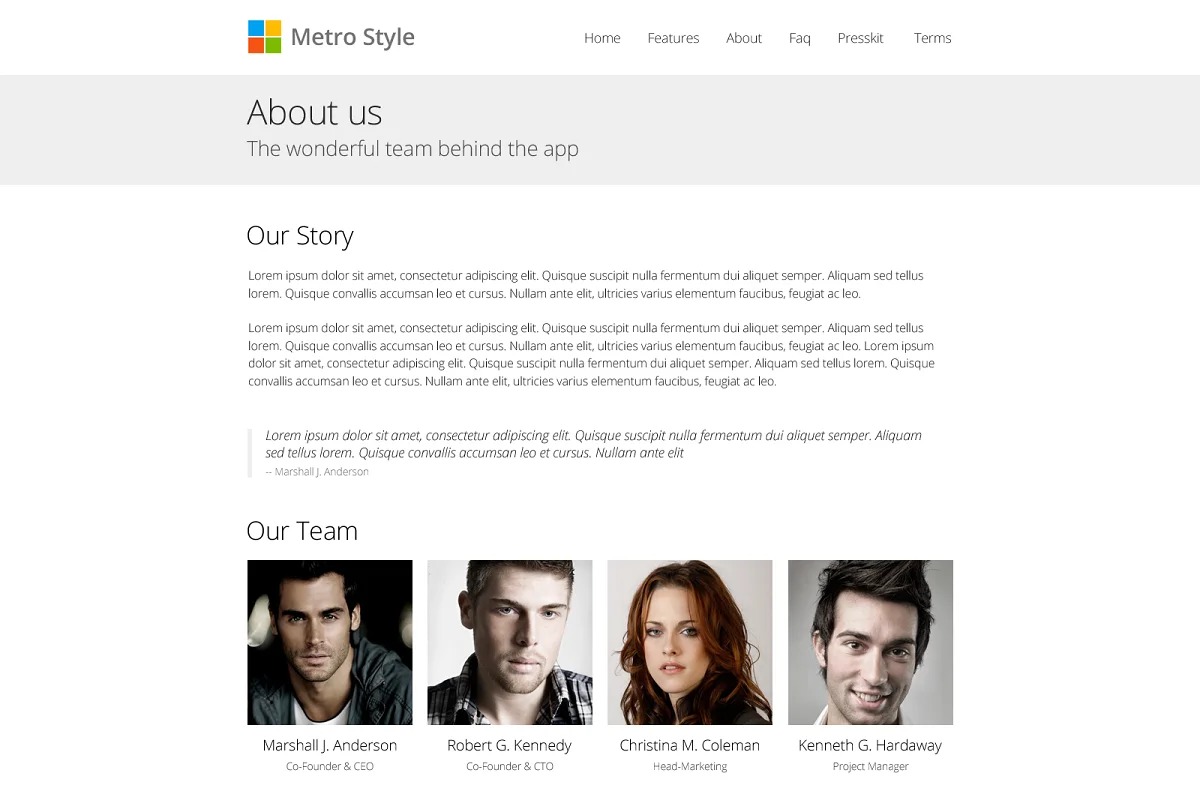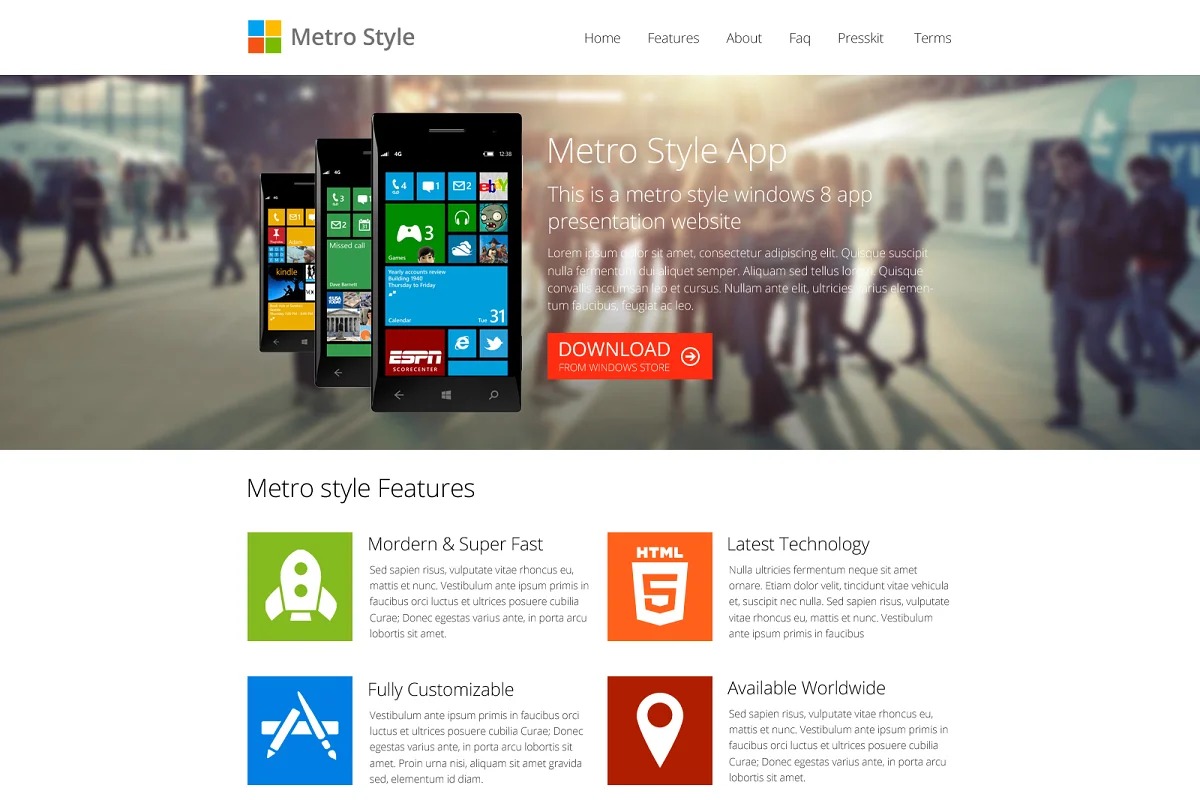 Metro Style is a Windows 8 App introduction Showcase Landing page site layout solely for those making Windows 8 App. There are part of App introduction for iPhone and android are accessible, however none of them suits Windows 8 application. So I made this format for those sort of individuals who were worn out on looking through Windows 8 App Website. This layout is Clean, Modern, Metro Style Flat Design and completely responsive dependent on Bootstrap. Four pages Included in HTML and PSD. Likewise I have made downloadable Press unit, FAQ page, About and Our Team page, Terms page that are valuable while delivering an App.