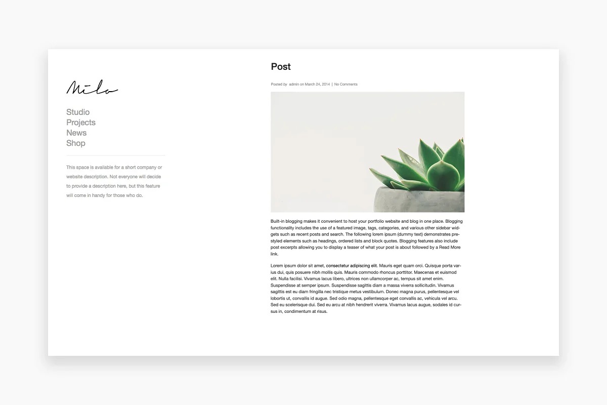 Planned as a genuine portfolio, Milo is worked for picture takers with an appreciation for moderation and a longing to introduce their online portfolio responsively across PC, tablet and cell phones. Milo is a lightweight WordPress topic highlighting a left-section route, falling sub-menu, thumbnail exhibition see, project depictions, dynamic picture scaling, WooCommerce® similarity and style controls, for example, shading plan and typography (Google® Fonts).