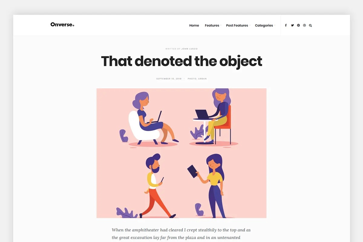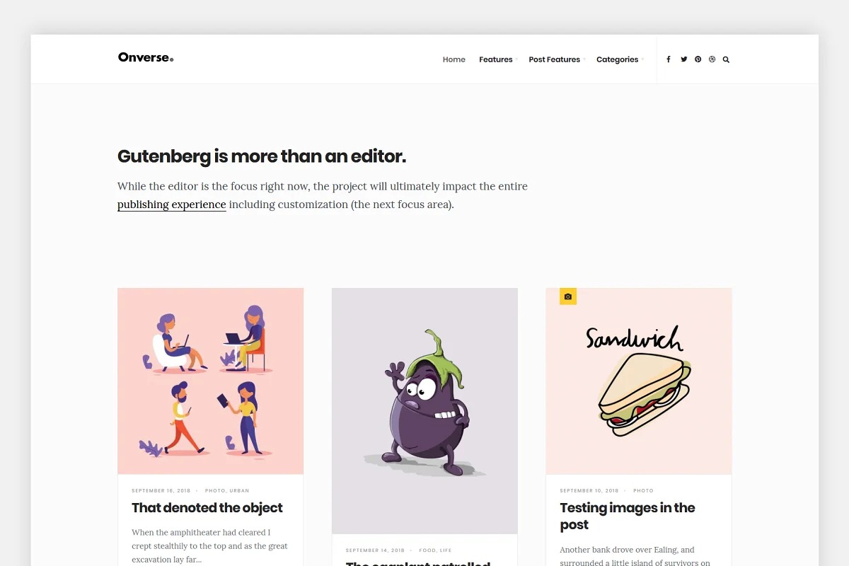 About the Product,Onverse is a minimalist and sleek responsive blog theme with modern design. Onverse is well integrated with Gutenberg plugin, a next-generation editor for your post and pages.,,Onverse integrates all Gutenberg blocks and features and wraps these to the clean design which makes your posts stand out from the crowd.,,Theme suitable for all kinds of blog, magazine, journal, creative or personal websites thanks to the straightforward layout.,,LIVE DEMO: http://gutenberg.wpmasters.org/onverse/,,Main theme features:,,Gutenberg ready,,Advanced theme admin panel,,Unlimited color schemes,,2 general layouts (single column vs content+sidebar),,Woocommerce compatible,,Post formats,,Font selector/custom typography (web-safe fonts and Google web fonts),,Font Awesome integration,,Custom Menu – with icons,,Dynamic widget section in sidebar,,Dynamic widget sections in footer,,Logo and favicon upload,,Google Analytics Input,,Custom Footer,,80+ design and layout options in admin menu:,fonts (countless families, colors, weight, styles, sizes),,backgrounds,,texts,,links,,hovers,,headings,,borders…,Tanslation ready, -Latest WordPress ready,,Extensive documentation,,XML file – dummy content,,And much more…