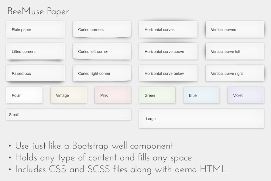 Included records: paper.min.css (4 KB minified CSS with seller prefixes created via Autoprefixer) paper.scss (200 lines of perfectly remarked code, including shading factors) index.html (useful demo of every single accessible style) boostrap.min.css (just to neaten the demo page)
