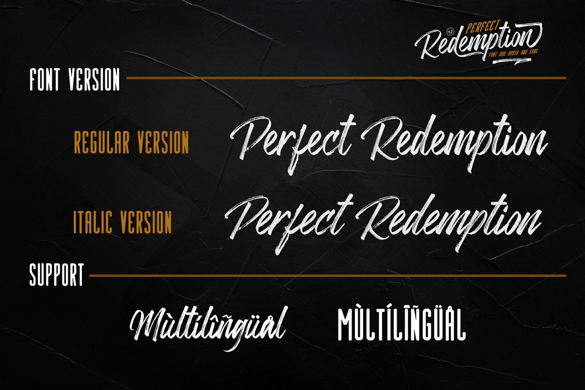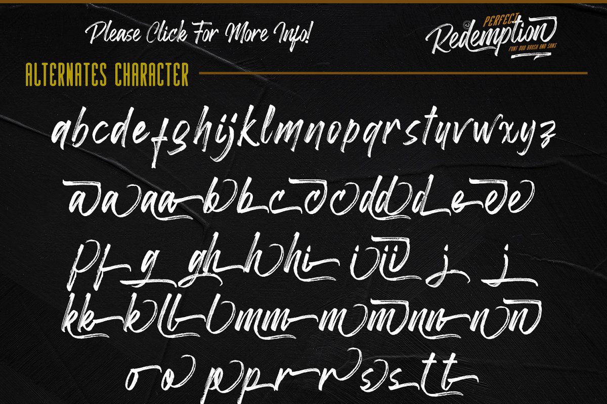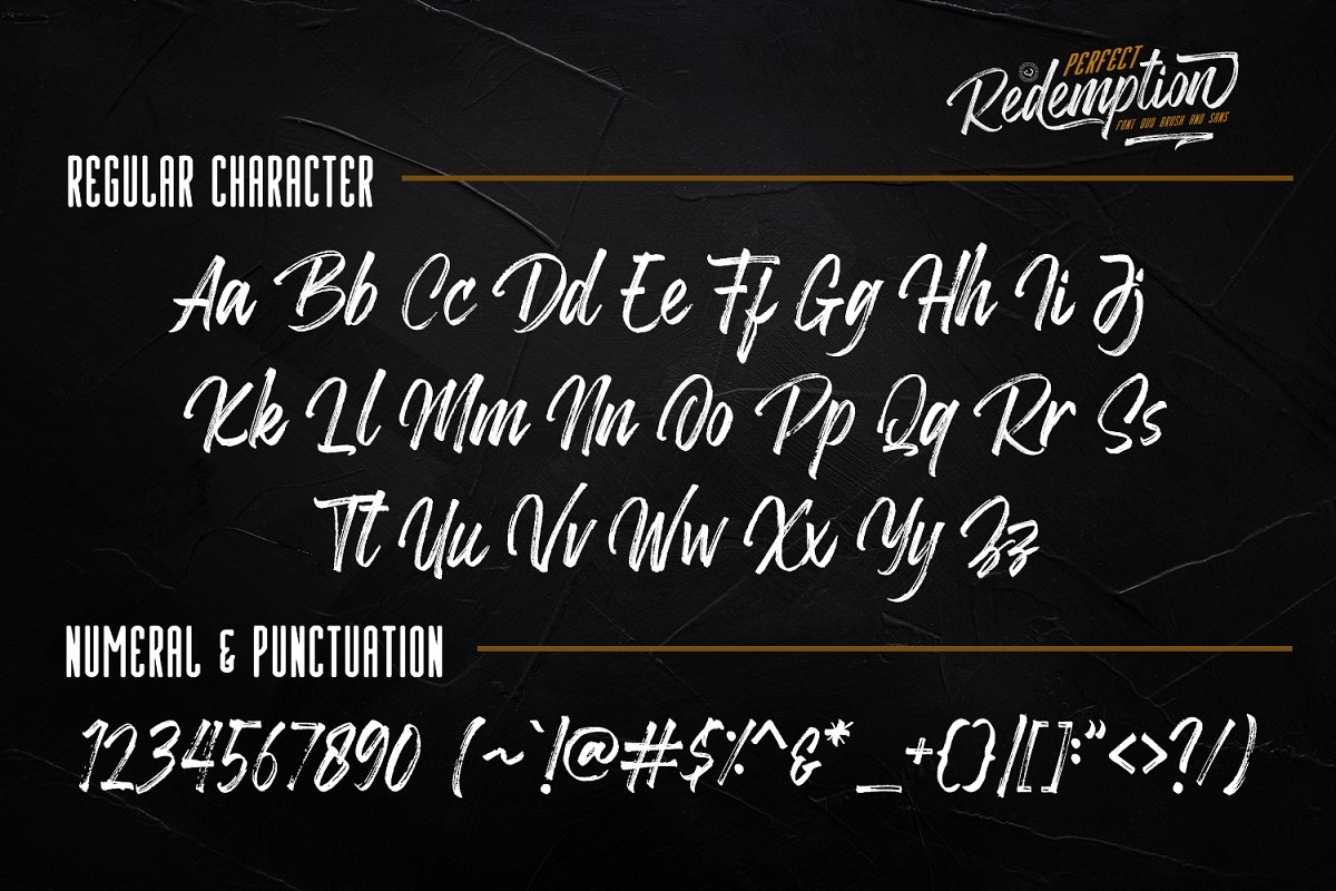 Presenting Perfect Redemption-Font Duo. Flawless Redemption is a brush text style and consolidates with sans textual style. Made with normally brush. The surface from the brush text style will make your structure increasingly wonderful and incredible. This text style is appropriate for any structure like marking, cites, shirt printing and so forth.