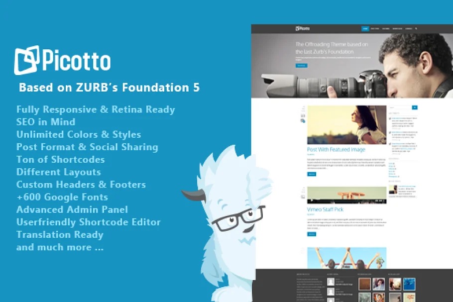 Picotto utilizes the most developed responsive front-end system, ZURB’s Foundation form 5. It offers responsive and adaptable plan, SEO semantics, versatile first and partials. Picotto is the expert decision for creators and innovative bloggers.