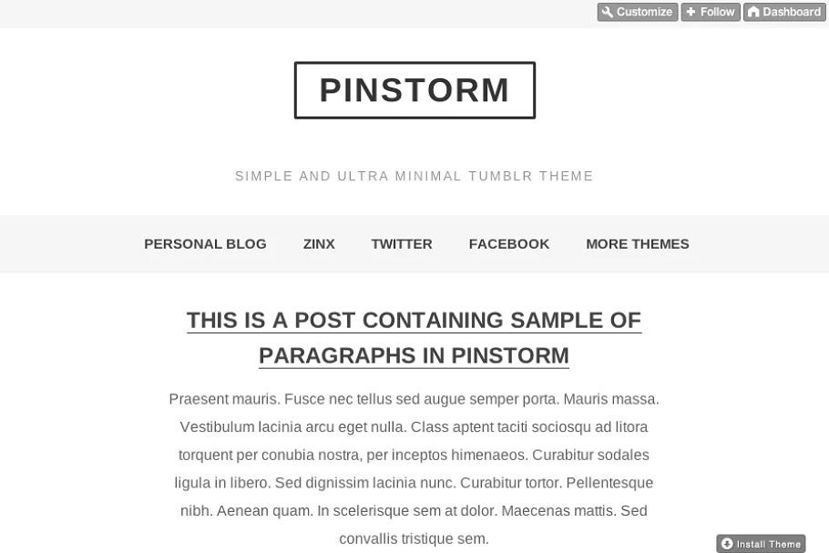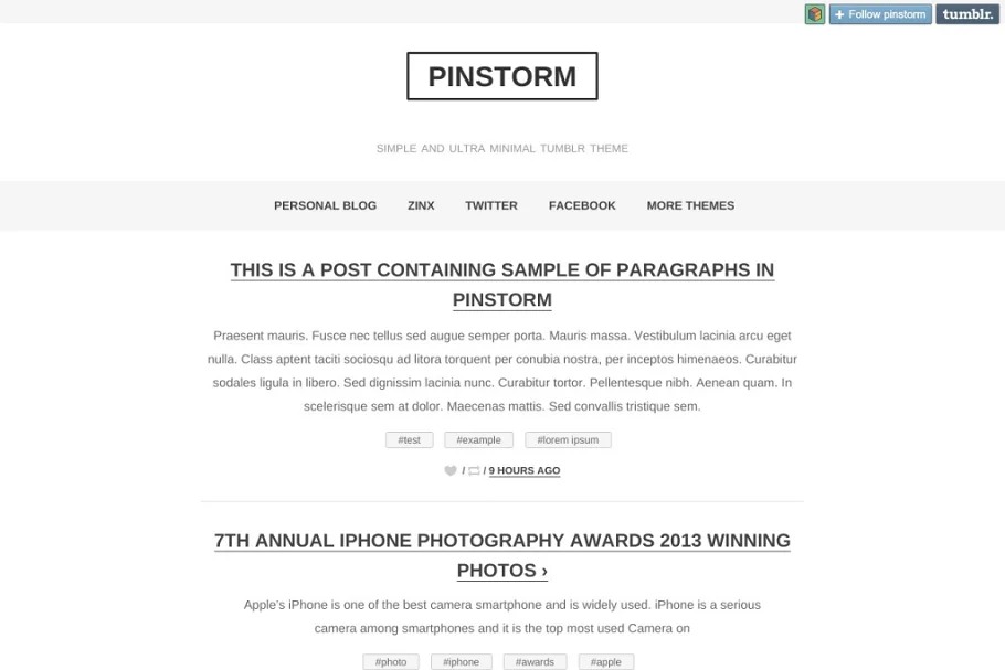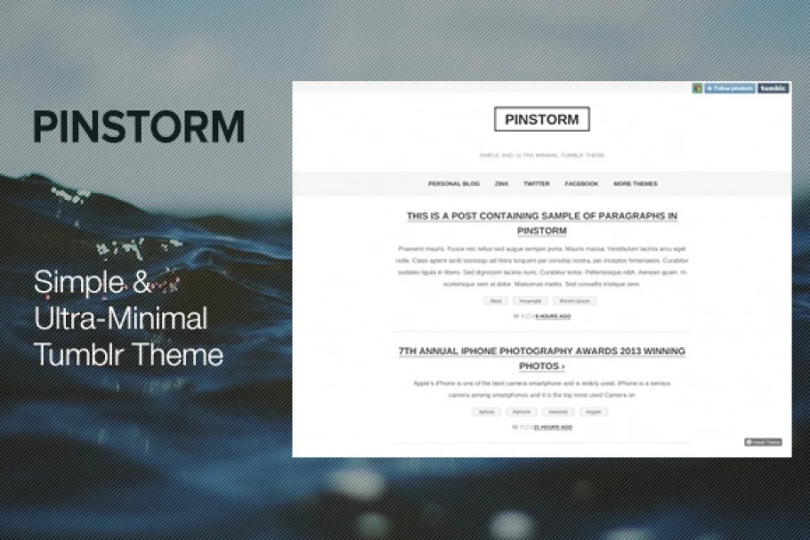 Pinstorm is a Simple, Creative and Ultra-Minimal Tumblr Theme for Professionals. PinStorm upholds a wide range of post sorts including Text Post, Photos, Photosets, Links, Videos and so forth