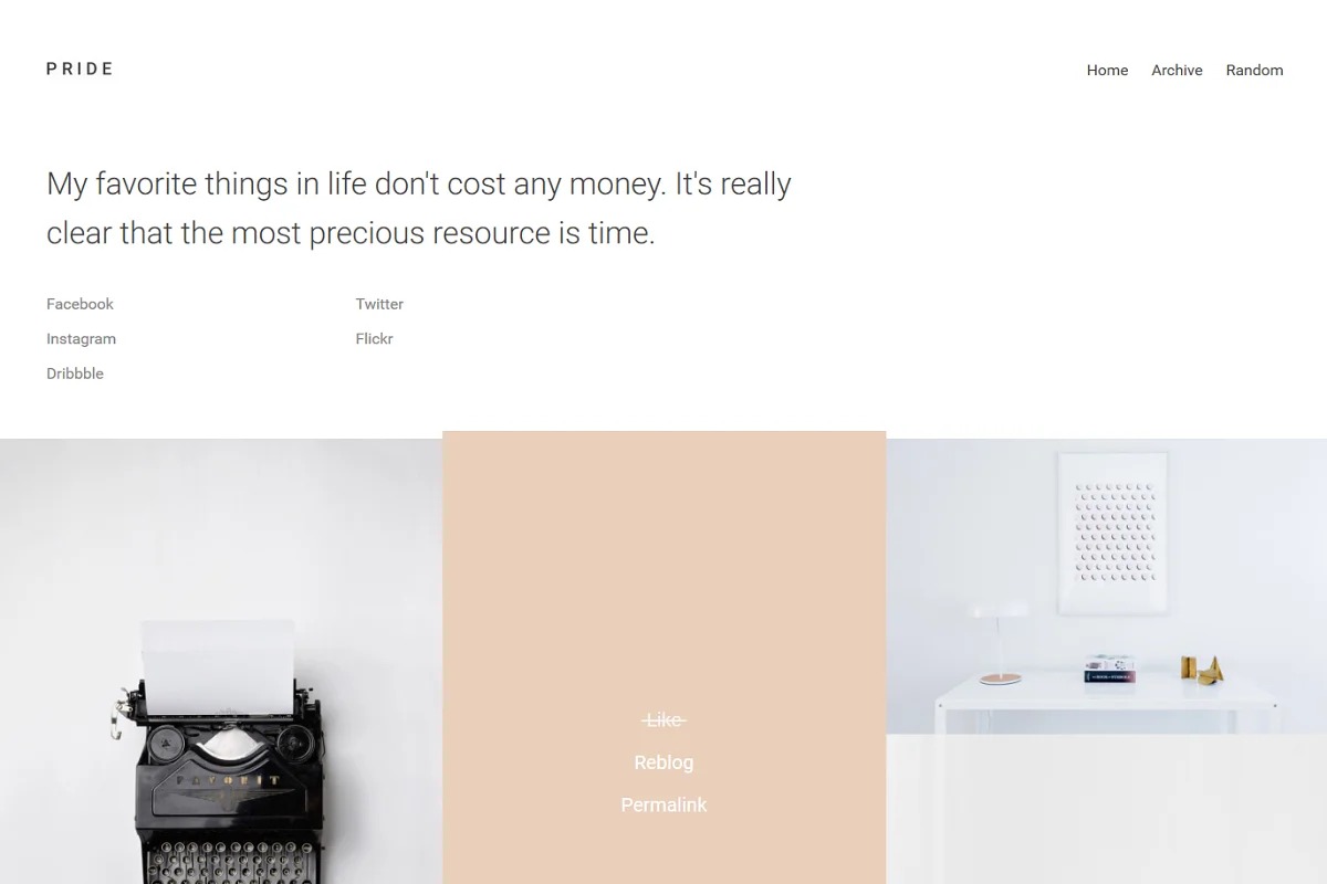 Pride is a negligible lattice based Tumblr topic. Present day and clean plan concentrate on a substance. The subject is completely responsive so it works and looks well on a work area just as on a cell phone. It accompanies bunches of simple to utilize customization choices.