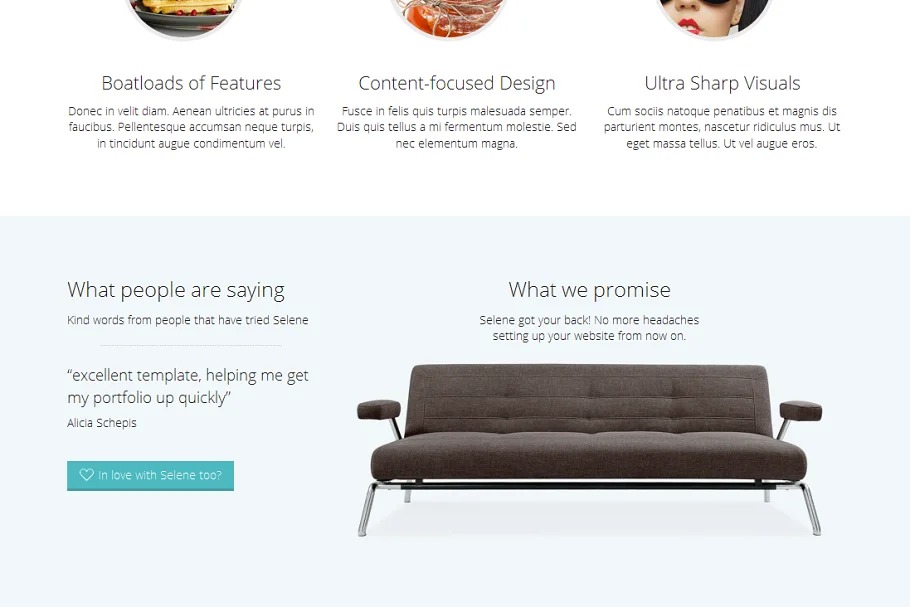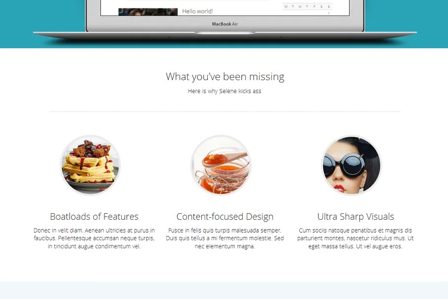 Clean, Minimalistic and Content-focused Design; Responsive; Boxed and Wide Layout; 2 Slider Layouts (MacBook and Full Width); Multiple Page Layouts; Custom Backgrounds and Sections; Filterable Portfolio; 35 Custom Shortcodes, with TinyMCE embed catches; Retina Icons; Featured Blog Post; Unlimited Sidebars; Social Sharing; Google Maps; Extensive Footer Menu; Advanced Admin Panel; Search Engine Optimized; Translation Ready;
