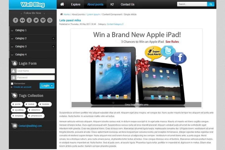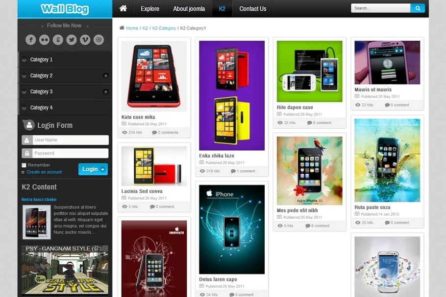 SJ Wall Blog – a responsive format with K2 is delivered with extraordinary design! Using an accordion static menu on the left sidebar, we can explore through numerous degrees of Website without any problem. SJ Wall Blog additionally includes a login structure and K2 label cloud directly in the sidebar for accommodation.