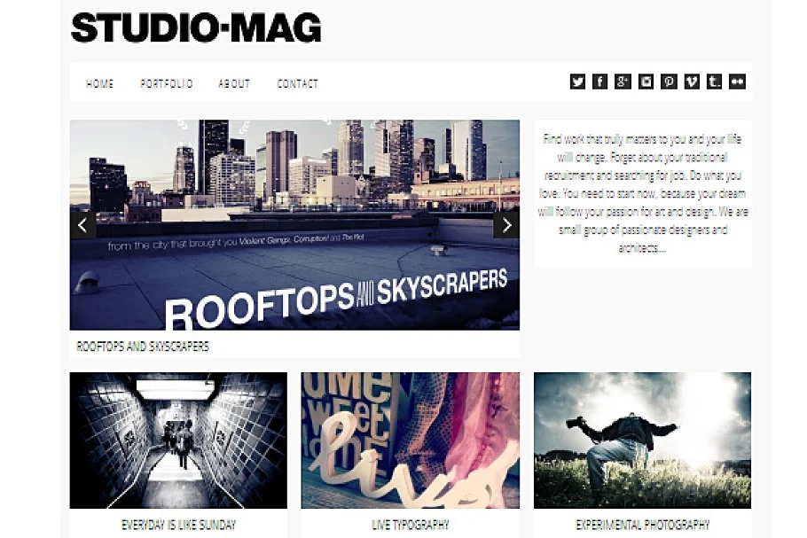 Studio Mag Responsive WordPress Theme is incredible subject for computerized blogger, with clean plan and insignificant design. Studio Mag topic has moderate style and versatile amicable plan. Outline Video Setup: http://vimeo.com/71789421 Infinite Scroll Video Feature Slider Video Feature Custom Background Image Custom Background Color 1-click cripple/empower slider Theme Options Menus Capability Responsive Design Responsive Layout Valid XHTML + CSS WordPress 3.6 Compatible Search Engine Optimized Chrome Compatible Safari Compatible Firefox Compatible IE9+ Compatible Support and Updates Theme Video Overview