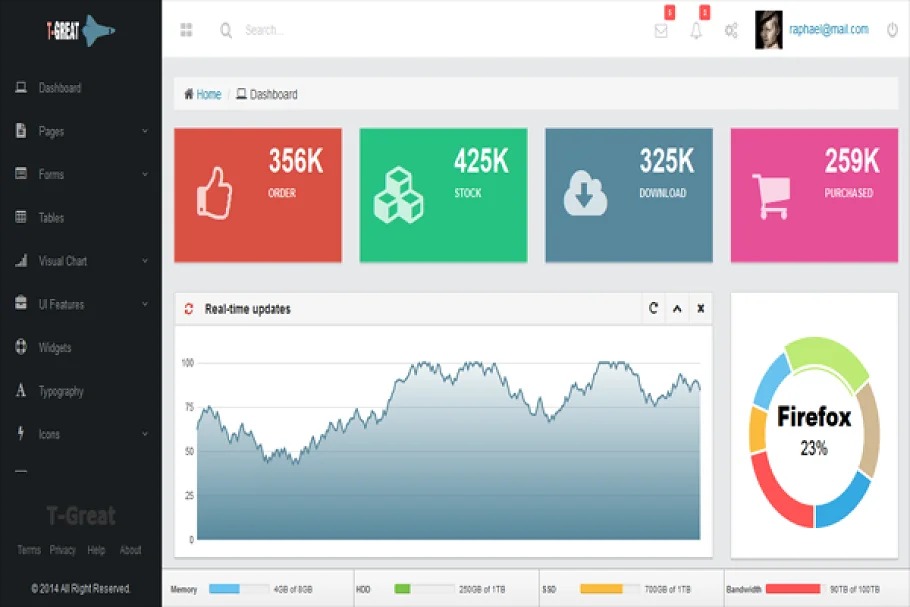 T-Great – Admin Template is a responsive Admin Dashboard with completely highlighted, premium, Bootstrap Admin Template with Modern Style. In view of Bootstrap 3.2 and Font Awesome help make this layout simple to utilized. Additional Pages: Invoice Inbox Profile Pricing Tables 404 500 LockScreen Login Register Dashboard Plugin Support: autosize picked datatables dropzone easypiechart editable flot fullcalendar check jquery-ui justgage jvectormap maskedinput mockjax second morris placeholder raphael select2 sparkline touchpunch wizard xcharts