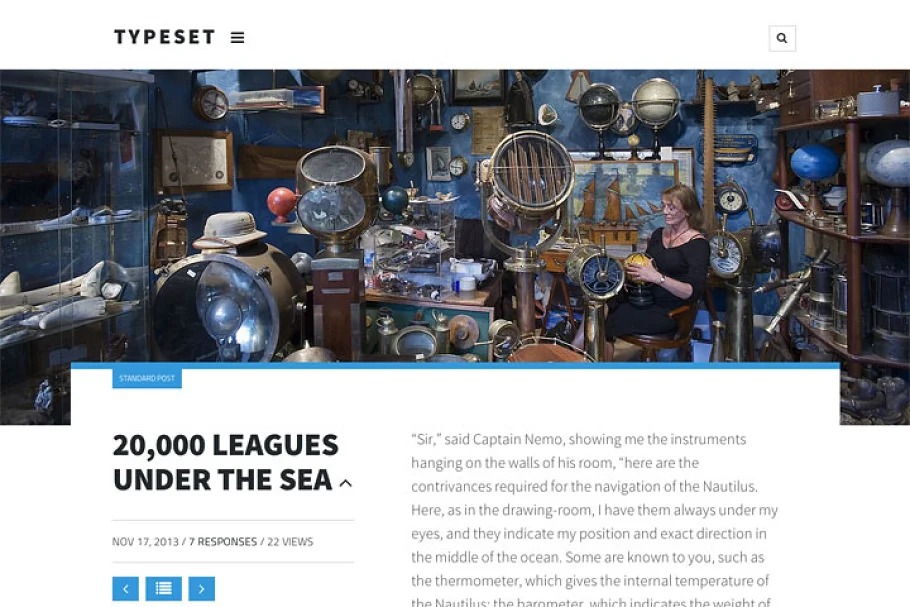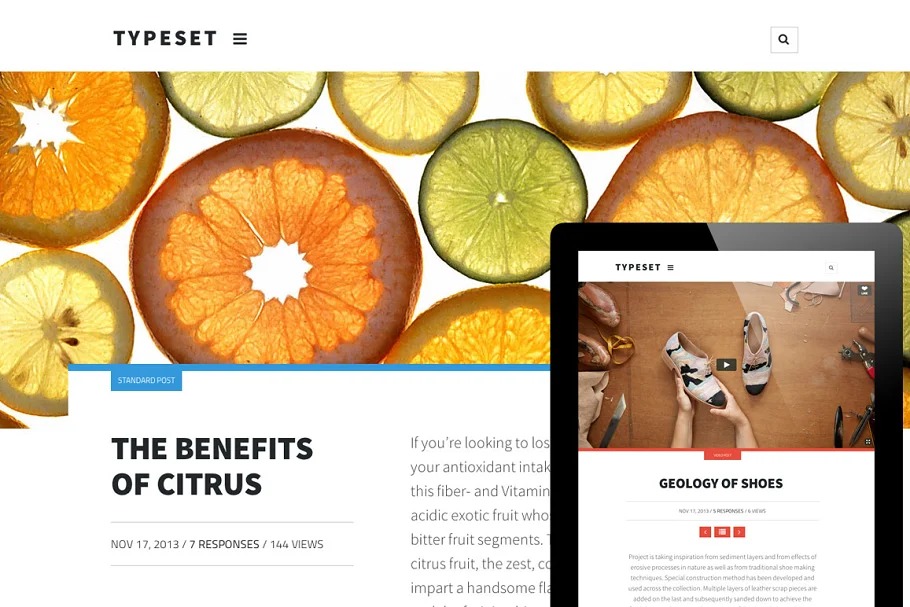 Typeset accompanies filterable portfolio, related posts merry go round, inbuilt editorial manager styles, inconspicuous shading complements for each post and backing for full width pictures, and video, ideal for multi-media distributing.