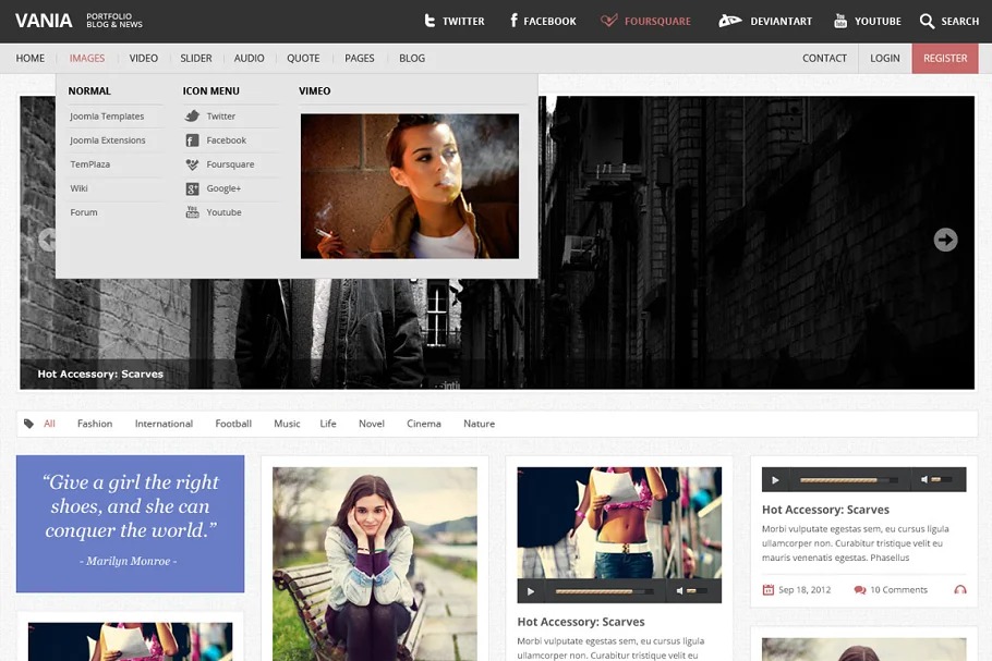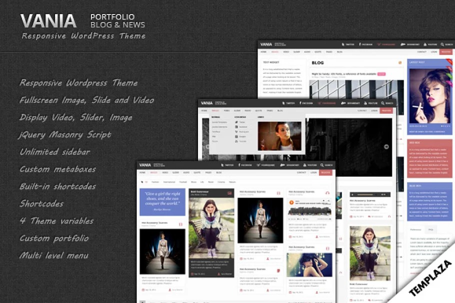 Full WordPress 3.5.1 Compatibility Fullscreen Image, Slide and Video Display Video(Youtube ID, Vimeo ID), Slider, Image jQuery Masonry Script Unlimited sidebar Custom metaboxes Portfolio Metabox Post/Page Metabox Built-in shortcodes Divide Shortcodes Space Shortcodes Column Shortcodes Dropcap Shortcodes Accordion Shortcodes Tabs Shortcodes Blockquote Shortcodes List Shortcodes Youtube Shortcodes empowered in gadgets Many foundation designs accessible Advanced topic choices board (Vania Options Section) Custom portfolio post-type with 2 custom layouts Multi level menu
