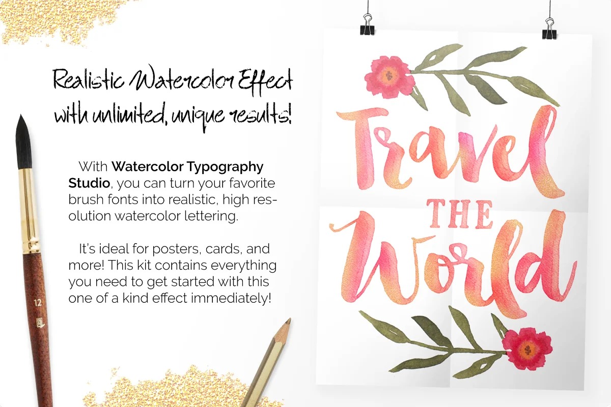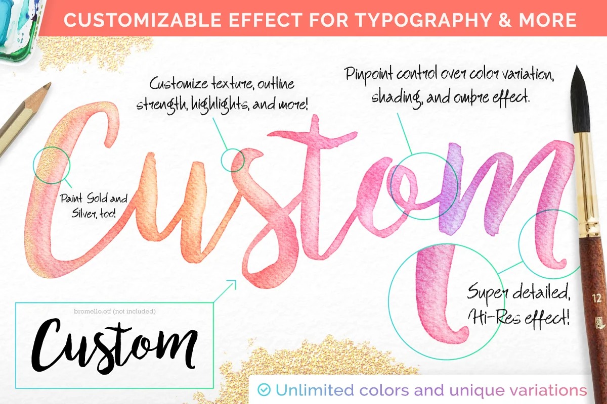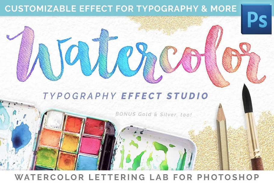 Watercolor Typography Effect Studio is an Add-on for Photoshop CS5, CS6, and CC that will permit you to change over dark content and shapes into bright, reasonable watercolor similarly as though it had been painted by hand!