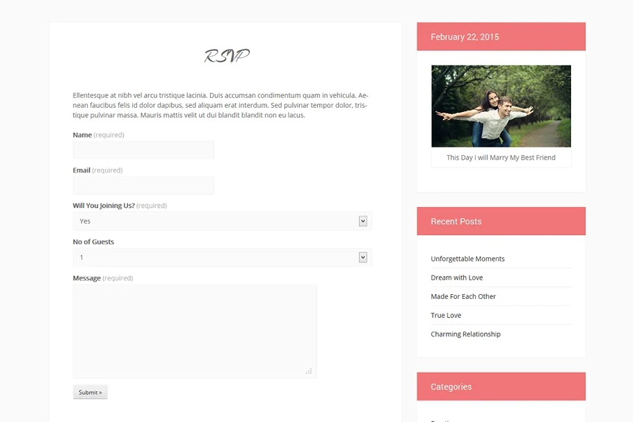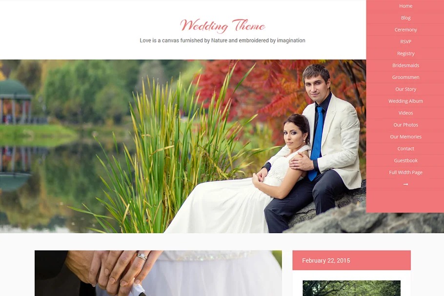 Wedding topic is additionally ideal for photography, travel, or such a portfolio site. Sidebars can be set to one side, right, or eliminated.
