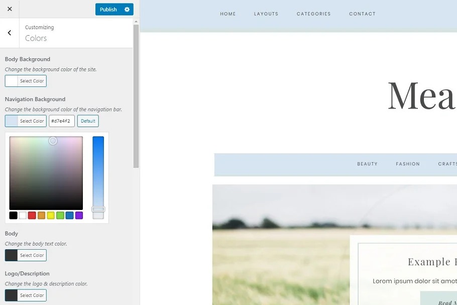 Effectively change a few shades of the body textual style, route menu, post titles, sidebar gadget header text and foundation, footer zone and catch foundations and text with our new customizer.