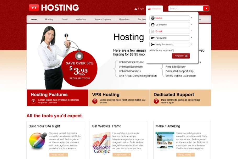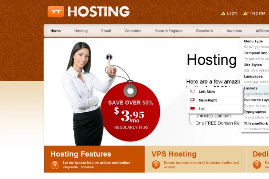 Yt Hosting Template which is made on Joomla stage will present to you a supportive site about facilitating administrations, area administrations… There are 4 webpage styles and you can pick any styles which you like for fundamental site. A solid place of Yt Hosting Template is utilizing menu framework with CSS Menu – essential impact, Moo Menu – astro light impact, Dropline Menu and uniquely Mega Menu which is upheld numerous highlights for showing your menus. You can study menu arrangement of us on here.