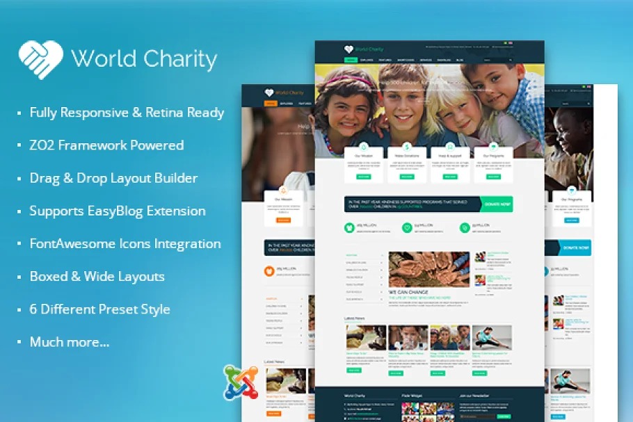 ZT Charity has a perfect custom landing page with a huge layer slider, stunning Custom HTML modules, Drop-down Mega menu, ZT Tabs, ZT News module and much more. You can assemble proficient and present day sites with this format. Set your tones, foundation pictures, change textual styles, change designs, make complex formats and visual setting for each pages in practically no time. All can be found in one incredible structure named Zo2 http://www.zootemplate.com/zo2.